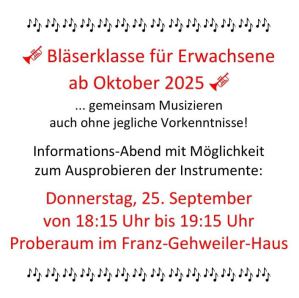 Donnerstag, 25. Juli von 18:30 Uhr bis 19:30 Uhr im Proberaum des Musikvereins im Franz-Gehweiler-Haus.