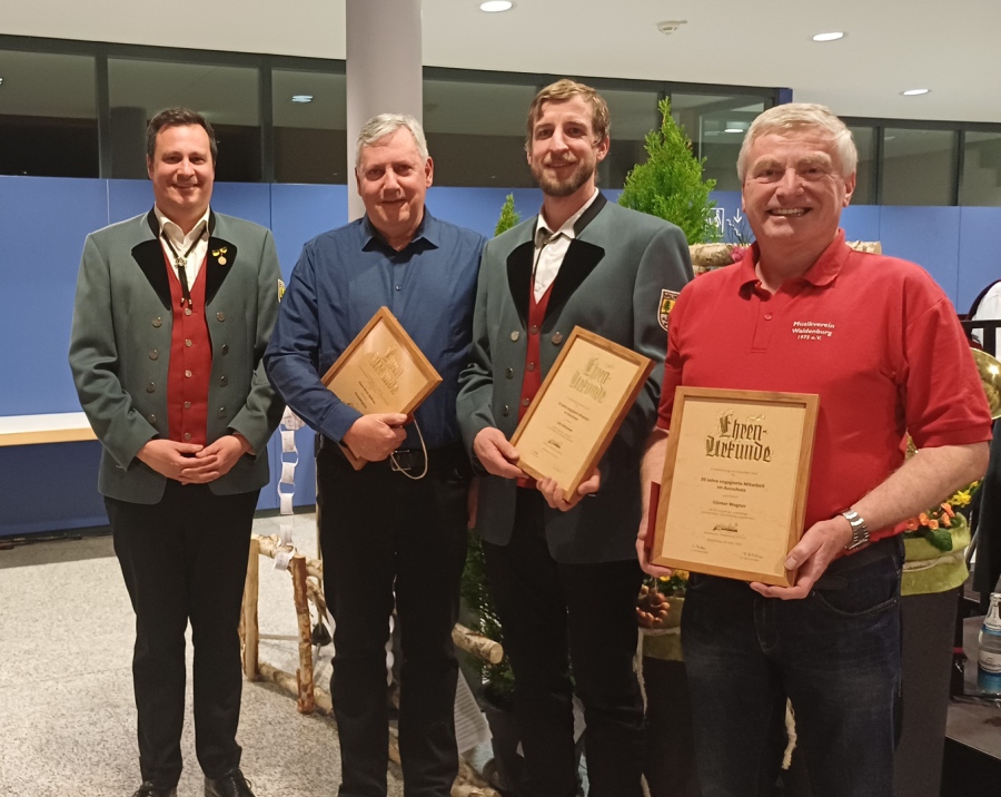 Für ihre bereits 20-jährige Tätigkeit im Ausschuss des Musikvereines erhielten Falk Kittsteiner, aktuell 2. Vorsitzender, und Günter Wagner, aktuell Kassier, jeweils eine Auszeichnung vom 1.