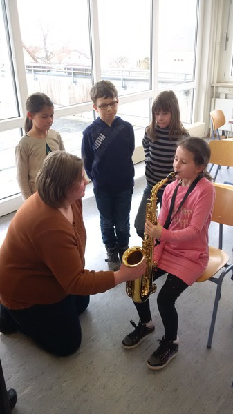 Nach dem gemeinsamen Pizza-Essen konnten die Kinder noch Saxophon, Tenorhorn oder Flügelhorn ausprobieren. Einigen gelang es dabei schon ganz gut Töne zu erzeugen. Viel zu schnell ging dieser