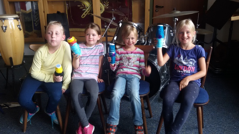 Nach der Besichtigung des Proberaumes inklusive Probetrommeln am Schlagzeug wurde Notenpapier bemalt und auf Klopapierrollen geklebt. Dies war dann die Hülle für die Rasseln, die gebastelt werden